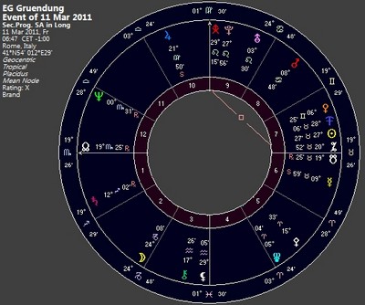 Astrologisch gesehen ist im Gründungshoroskop der europäischen Gemeinschaft eines besonders deutlich zu erkennen: Technikfixiertheit! Aufsteigender Mondknoten in Skorpion bedeutet, dass man alte traditionelle Agrargesellschaften (Gegenzeichen Stier) hinter sich lässt. Sozusagen mit aller Gewalt ohne Erkennen von Folgen (Neptun steht beim aufsteigenden Mondknoten) arbeitet man am technischen Fortschritt. Genau dies wird symbolisiert durch Herrscher Pluto zehnten Haus, der in Konjunktion mit Zeus das angestrebte Ziel markiert. Pluto steht für die Gewalten, die man bereit war zu mobilisieren. Darunter auch die Kernenergie. Die markante Stellung von Pluto und Zeus zeigt, dass es (der Politik!) beinahe einzig und allein darum ging, technische Fortschritte zu generieren und voranzutreiben. Der Wendepunkt konnte eintreten, als der sekundär progressive MC endlich diese Pluto/Zeus-Kombination transitierte: Fukushima.