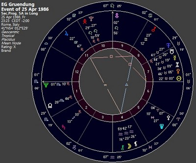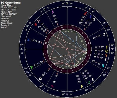 Wie im Gründungshoroskop der europäischen Gemeinschaft zu erkennen, hatte man sich Ende der 50er Jahre aufgemacht, plutonische Kräfte zu entfesseln: der aufsteigende Mondknoten lief durch den Skorpion, Neptun stand im Skorpion, Herrscher Pluto mit Zeus dominiert im 10. Haus der Ziele und Mittel.