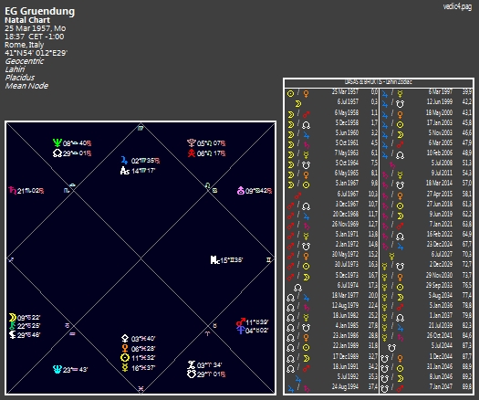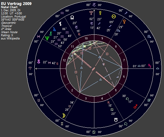 Im ersten Haus der Gründung der Europäischen Gemeinschaft sehen wir einen optimistischen Jupiter in der Jungfrau. Die Aufbruchstimmung der Fünfzigerjahre des vorigen Jahrhunderts ist hier deutlich zu erkennen. Hoffnung auf ein produktives Miteinander (der Aszendenten sowie der Jupiter stehen im fleißigen Zeichen Jungfrau) bestimmen den Geist der Nachkriegszeit. Im zweiten Haus steht Neptun im Sternzeichen Waage. Den Bereich, in dem sich Neptun befindet, könnte man (als gedanklichen Versuchsaufbau) mit dem schwächsten Glied der Kette im Sinne Luhmanns assoziieren. Dies sind also in diesem Fall die Finanzen. Eine Währungsunion, also alle Währungen in einen Topf zu werfen, war bei der Gründung der Europäischen Gemeinschaft im Sinne der Stärkung des schwächsten Systemteils also logische Konsequenz. Im dritten Haus sieht man die Verträge der EG und deren Grenzen (Saturn). Das Grundhoroskop der Gründung der Europäischen Gemeinschaft ist, trotz aller wirtschaftlichen Verpflichtungen, erst einmal konsequent auf die Abgrenzung der einzelnen Länder untereinander bedacht. Der MC steht in Zwillinge und spricht dafür, dass man damals der Meinung war, mit Kommunikation und Verhandlungen alles ins rechte Lot bringen zu können. Herrscher Merkur steht mit Sonne, Venus und Pallas im siebten Haus in Fische. Man argumentierte also auf Augenhöhe, versuchte die Verhandlungspartner ernst zu nehmen und, im wahrsten Sinn des Wortes, alle mit ins Boot zu holen. Mars mit Chronos im Stier im neunten Haus deutet auf den Austausch von Arbeitskräften, sowie auch die Förderung selbstständiger Tätigkeiten, also Handwerk und Unternehmertätigkeiten. Im Grundhoroskop der EG ist also Arbeitsmigration explizit festgeschrieben und wesentlicher Teil der Ideologie. Ausländische Arbeitskräfte bringen Wohlstand (ins Land) und ebenso auch wirtschaftlich und gesellschaftlich gut verwertbare Fähigkeiten mit. Die EG an sich baute also auf Finanzen und Wirtschaftsverträge die gleichzeitig das schwächste Glied der Kette sind. Besonders dann, wenn bestimmte Länder wirtschaftliche Schwächen oder Unklarheiten produzieren.