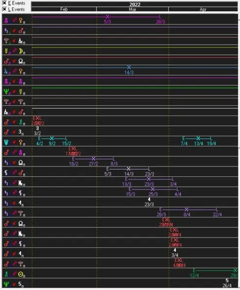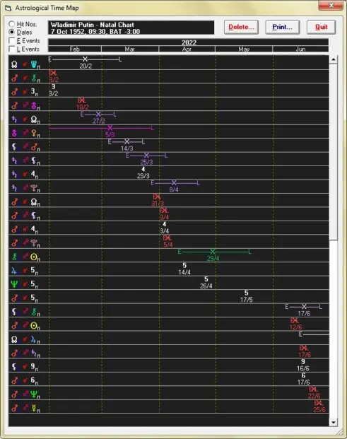 Hier habe ich mit der fiktiven Geburtszeit wichtige Transite der nächsten Wochen ausgerechnet. Saturn Mondknoten (18.2.-8.3.) wird ihn zu Größenwahn veranlasst haben. Diese Konstellation gibt es ca. alle 30 Jahre. Er dachte, die Erfahrungen der vergangenen Jahre machten in jetzt zum rechtmäßigen, asoluten autokratischen Herrscher. Mars läuft auf diesen Mondkonten noch einige Tage (bis Ende März) zu, was ihn reizbar und noch gefährlicher macht.Der schwarze Mond läuft in Opposition Radixmars vom 5.3.-23.4. eine Killerkonstellation. Man MÖCHTE töten. Am 5.3. war die Konstellation Venus mit Uranus exakt, was zu einem erheblichen atomaren Gefahrenpotential geführt hat. Wohl nur durch Glück sind wir einer Kernschmelze im angegriffenen Atomkraftwerk entgagen. Diese Konstellation läuft bis 28.3. aus, was noch keine Entwarnung verspricht. vom 15.3.-4.4. transisitert Saturn den Radix schwarzen Mond, was größere Zerstörungen von Gebäuden und Infrastruktur bringen kann, aber auch für ihn selbst nicht ganz ungefährlich ist. Seine scheinbaren Gegener erscheinen im noch gefährlicher und zerstörenswerter als vorher. 28.3.-22.4. könnte durch Saturn Opposition Radix Pluto eine wahre Zerstörungsorgie losgetreten werden. Alles im vermeintlichen Zustand, das "richtige" zu tun und die "Abtrünnigen" wieder "heim ins Reich" zu holen oder mit Stumpf und Stiel auszurotten. Gleichzeitig ist die Konstellation Transitmars am aufsteigenden MK Ende März exakt. Eine gefährliche Eskalationskosntellation, bei der er noch einmal alle Register ziehen könnte...DOCH was ist, wenn die Konstellationen, die diesen Feldzug bis dahin befeuern, plötzlich nachlassen? Anfang April transistiert der Mars den Radix schwarzen Mond und könnte viele Tote verursachen (wollen). ABER am 12.4. beginnt seine Konstellation mit Chiron Sonne. Ist er dann schon Herrscher der Ukraine, oder geht ihm die autoritäre "Luft" aus. Mars Opposition Pluto, ebenfalls Anfang April, wird er vielleicht noch mit Gewalt ausagieren können. Danach ist "Sense". Saturn, Mars und Venus laufen aus dem 3. Haus (Angriff auf die nähere Nachbarschaft) ins 4. Haus, sofern die angenommene Geburtszeit plausibel ist. Sein eigenes Land, seine eigene Bevölkerung, seine "Familie" könnte die Unterstützung verweigern. Was wird er dann ernten. Diese starken Saturn und Mars-Aspekte geben ihm Kraft, Energie und Durchhaltevermögen. ABER hat er Astrologen, die ihm die Phasen mit ihren Auf- und Abs erklären oder schwelgt er in dem Gefähl, was er jetzt glaubt zu erreichen oder erreicht zu haben, würde seiner Grundkonstellation und zukünftigen Kraft entsprechen. Man muss jedoch auch sehen, dass einiger dieser Transite noch einmal in den nächsten Monaten zurückkommen. Wer weiß, wie dann die Ausgangslage ist.