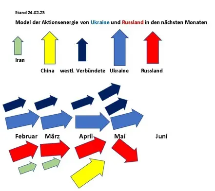 In meiner Vorstellung könnte es so wie in der Pfeilegrafik weitergenen. Ob Russland überhaupt noch wirkungsvoller werden kann, könnte an Verbündeten, also z.B. dem absolut unvertrauenswürdigen China liegen. Bei Indien weigere ich mich noch zu unterstellen, eine derart böse und dumme Tat zu unterstützen. Die Rethorik von China ist höchstbedenklich und ist dementsprechend als neue Feindeslinie zu rechnen. Ein wirklich perfider Friedensplan von China könnte ja z.B. heißen an den Westen: legt die Waffen nieder, sonst steigen wir auf Seiten Russland mit ein..WAS ich überhaupt nicht verstehe: An Stunde 2 des Konflikts hätten alle Betroffenen (also der Westen inkl. USA) sofort und kontinuierlich die Waffenprduktion hochfahren sollen. Mir kann keiner sinnvoll erklären, wieso das nicht geschen ist. Vielleicht Glaube an das Gute im Menschen und wird schon nicht so schlimm werden oder ganz normale Daddeligkeit? Aber es spricht doch so oder so nichts dagegen, vorbereitet zu sein. Tag minus 1 des Kriegsbeginns bin ich letztes Jahr in den Schützenverein eingetreten, um an verschiedenen Waffen zu üben. Für jemanden wie mich, der sich mit Prognosen und Vorahnungen beschäftig war das zwar knapp, aber immer noch VOR dem Ereignis. Aber an Tag was weiß ich 200 immer noch über Kriesgerät ja oder nein zu diskutieren erhöht jedesmal gewaltig meinen Blutdruck.
